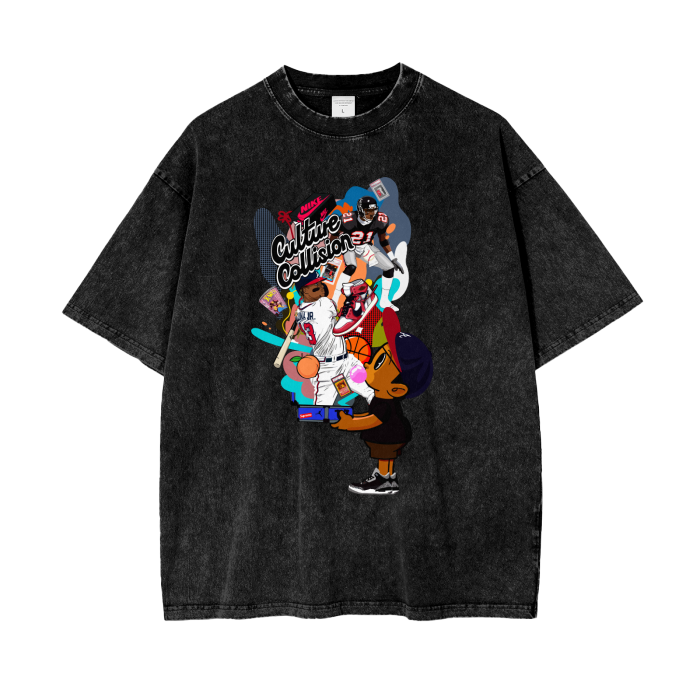 Notes:When printing, the image you uploaded will be covering the original stone wash patterns through DTG technology.